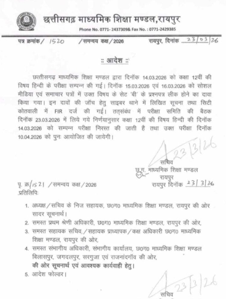 रायपुर। छत्तीसगढ़ माध्यमिक शिक्षा मंडल ने 12वीं हिंदी विषय की परीक्षा रद्द कर दी है। यह फैसला पेपर लीक की आशंका के चलते लिया गया है। अब यह परीक्षा 10 अप्रैल 2026 को दोबारा आयोजित की जाएगी।